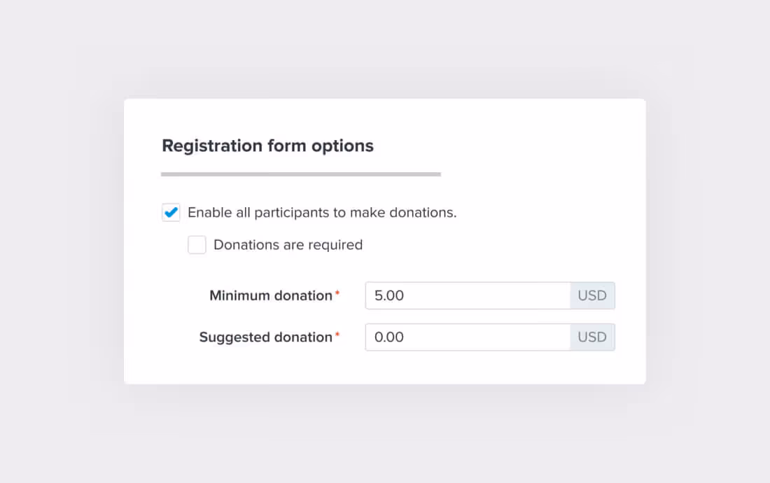 Offer a simple way for your registrants to give back on the spot during registration. Your participants can give to a cause that you have specified--no fundraising page or extra steps required--and their donation is itemized in the cost of their registration during check-out.