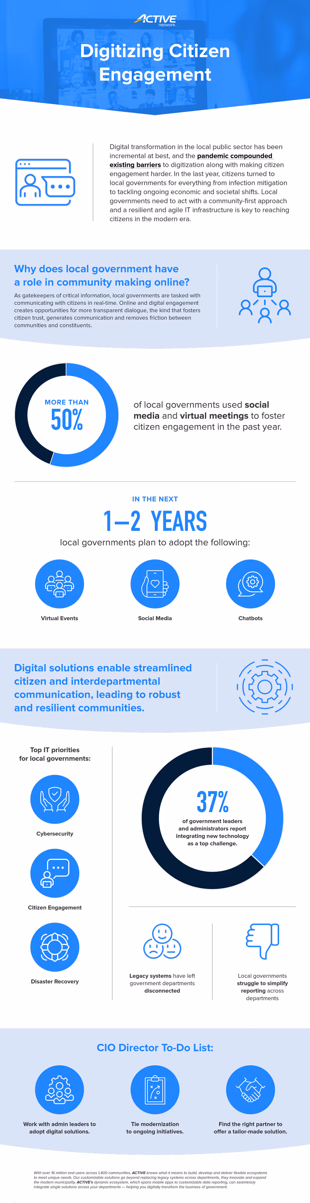 As gatekeepers of critical information, local governments are tasked with communicating with citizens in real time. Online and digital engagement creates opportunities for more transparent dialogue. However, digital transformations in the public sector have been slow. Local governments need to act with a community-first approach, the kind that fosters citizen trust, generates communication and removes friction between communities and constituents. Checkout the infographic below & download the full report, here.