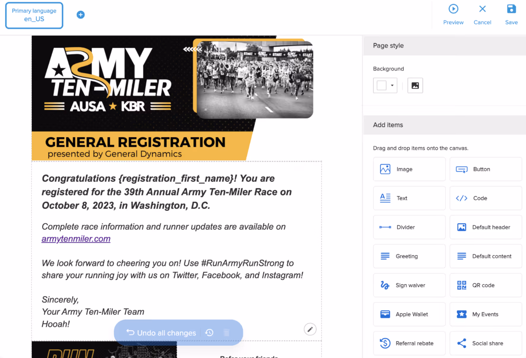 With fully customizable email templates, you can create multiple confirmation emails for different categories. For example, if you host a charity race, you can design a custom email tailored specifically to your charity runners—highlighting donation opportunities or sponsor acknowledgments right within their event confirmation email.