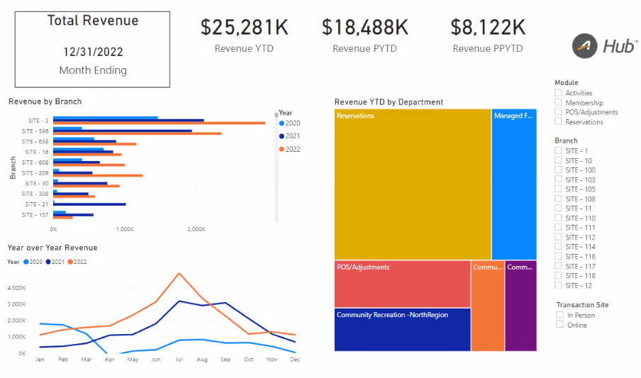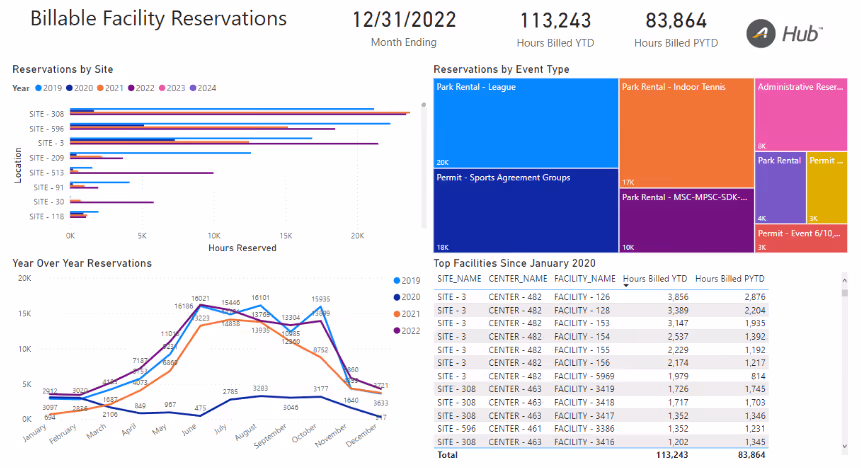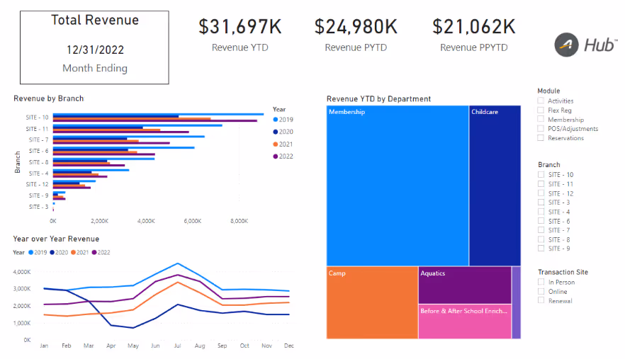 Ever wish you could wake up on January 2 and simply pop open reports of how your previous year ended? Well, with ACTIVENet Hub and a business intelligence tool like PowerBI, that wish can be a reality! The structure of Hub data makes it easy to put together meaningful visualizations of your operational trends, and since it is updated in near-real time, you can create automations that refresh your visualizations as soon as a month or year comes to an end.